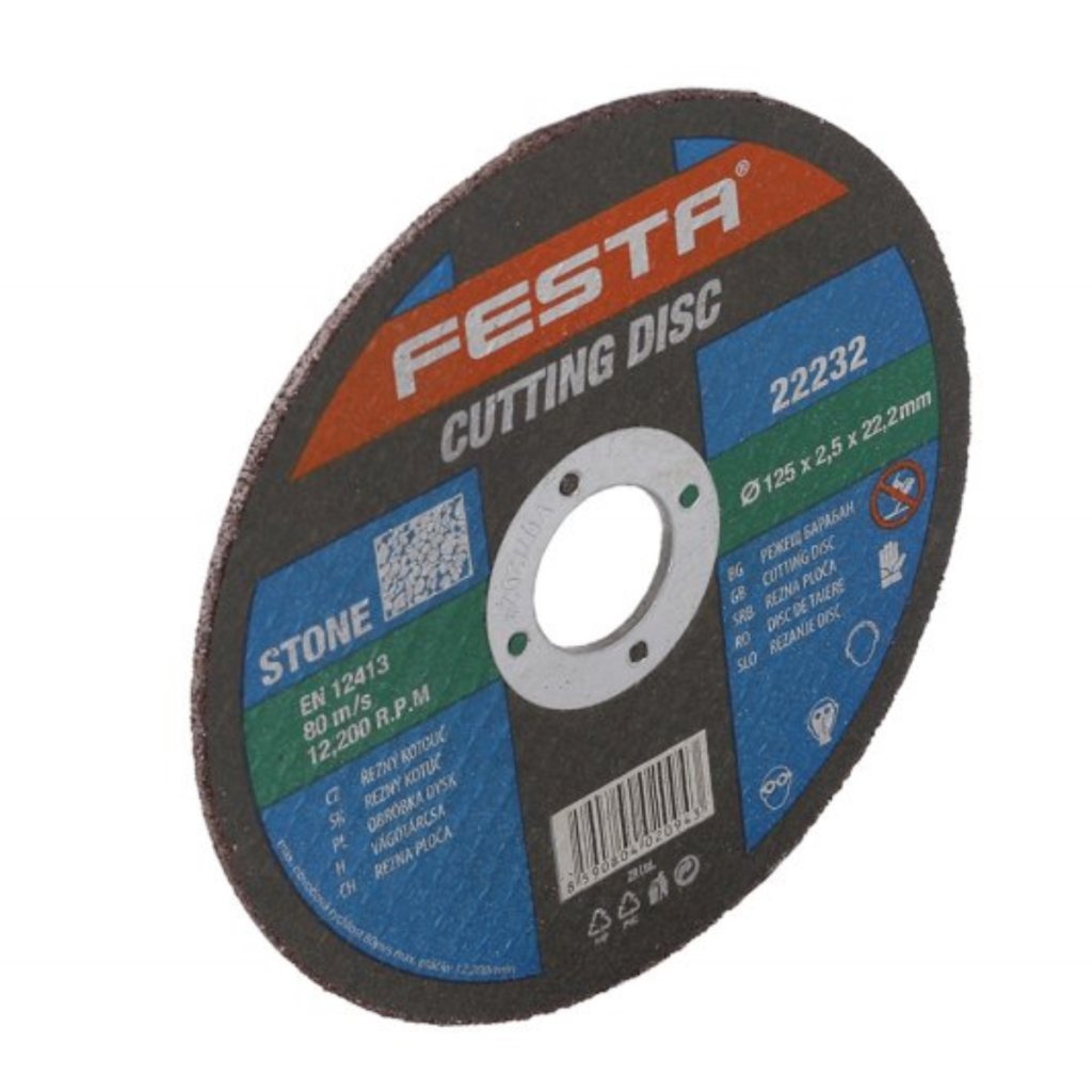 A kiváló minőségű FESTA **köves vágókorong** **szilíciumkarbid szemcsékkel van ellátva. Ez **nagyon 80 méter/másodperc sebességre van méretezve, és a maximálisan megengedett sebesség 12200 percenként. A csiszolókorong méretei 125 x 22,2 x 2,5 milliméter.